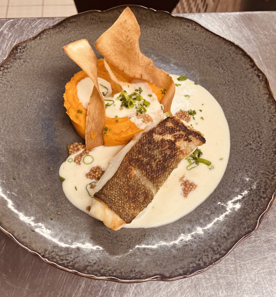 Moules marinières, frites Poulpe, sauce Viana do castelo (poivrons, tomates et ail réduits au porto), céréales Suprême de poulet, jus corsé, écrasé de pommes de terre Filet de dorade royale, écrasé de pommes de terre et sauce vierge